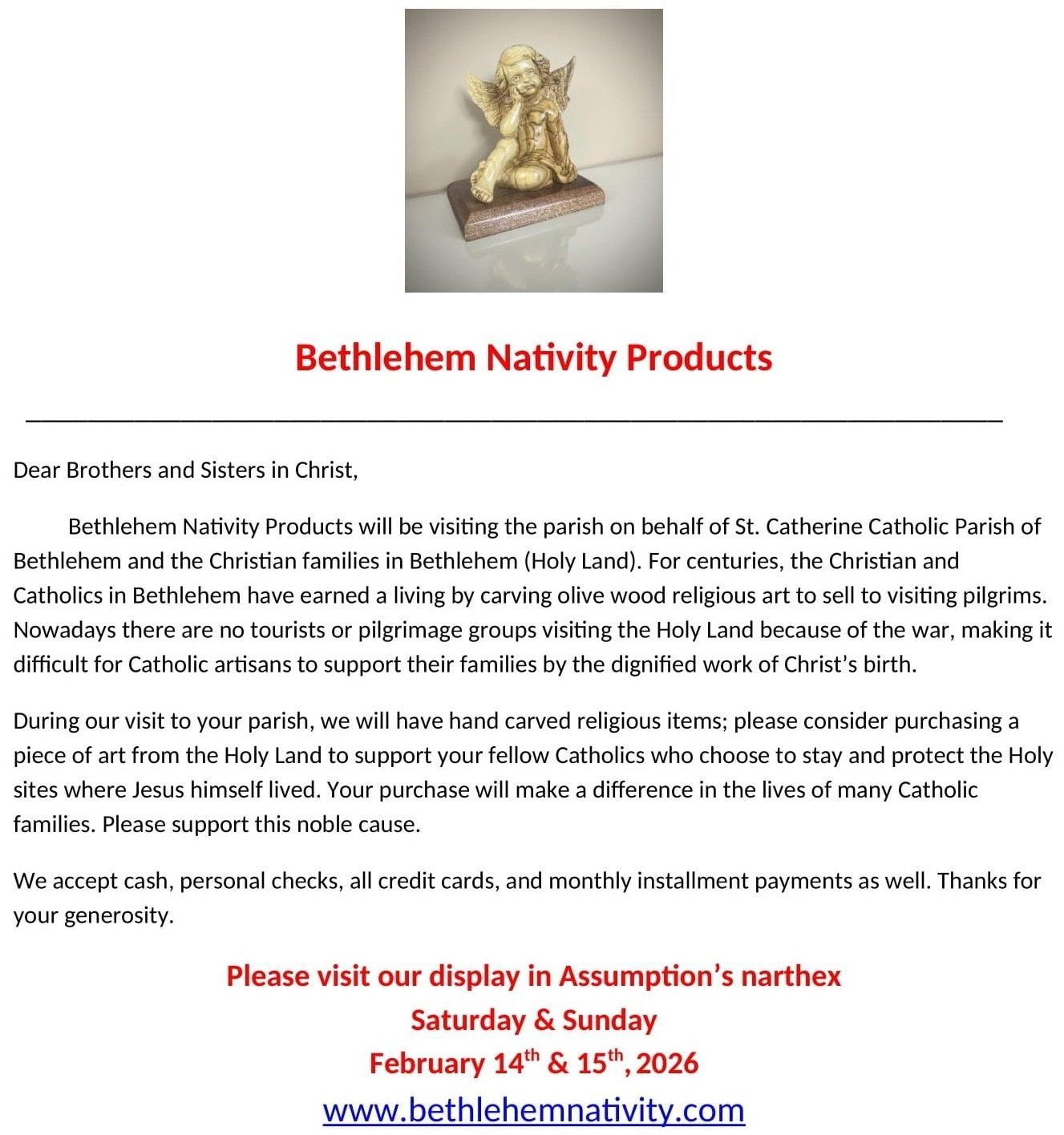 Weekend of Feb. 14/15 - Bethlehem Nativity Products @ Assumption Church